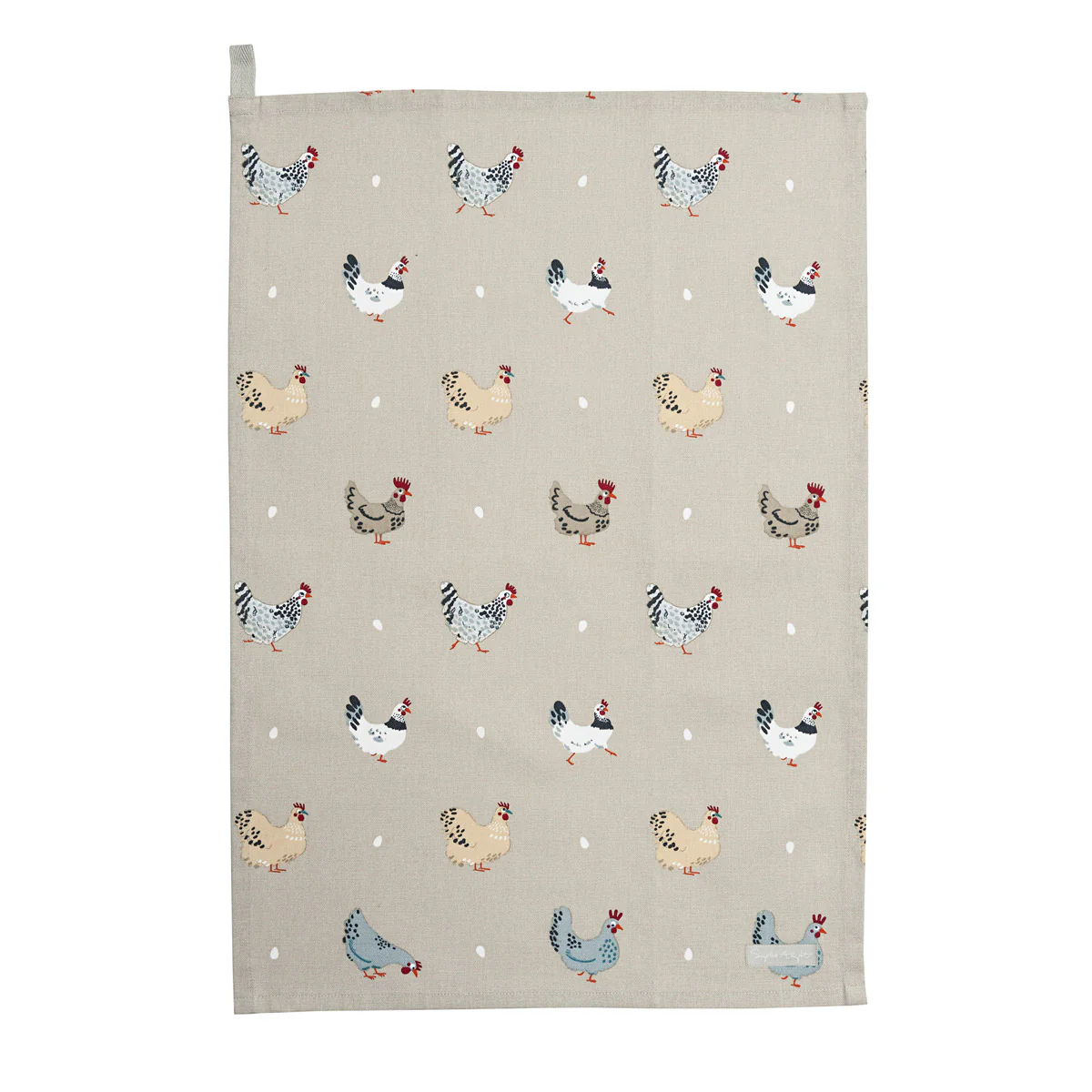 A pair of practical cotton tea towels covered in Sophie's illustrations of different hens. One is oat stone coloured, the other is sage grey.