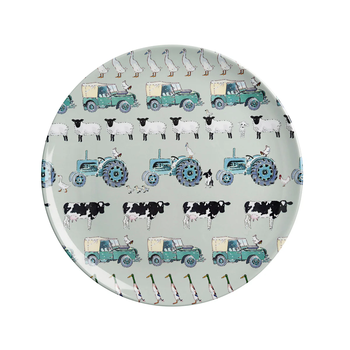 This farm themed seven piece dining set includes a plate, bowl, cup, knife, fork, spoon, and egg cup. A lovely little gift set for children's birthdays and christenings. The design features tractors, Land Rovers, sheep, cows, sheepdogs, and chickens on a green background. Bound to appeal to all those farmyard fans!